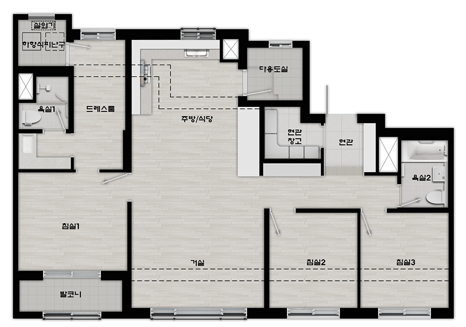 시스템에어컨 옵션 선택 시 냉매배관(거실+침실1)은 설치되지 않습니다.