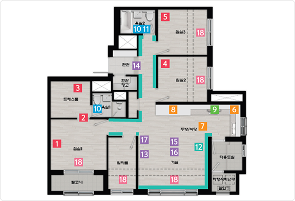 | 18-2 | 거실+침실1+침실2+침실3+알파룸(실내기5대) | 유상 |